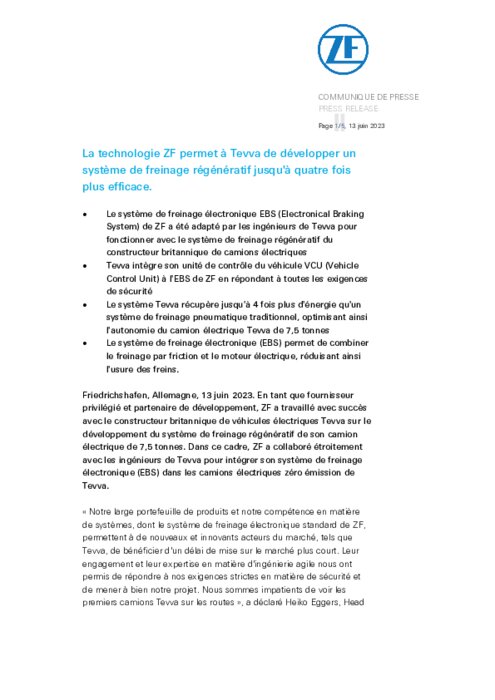 Le système de freinage électronique EBS (Electronical Braking System) de ZF a été adapté par les ingénieurs de Tevva pour fonctionner avec le système de freinage régénératif du constructeur britannique de camions électriques. Tevva intègre son unité de contrôle du véhicule VCU (Vehicle Control Unit) à l'EBS de ZF en répondant à toutes les exigences de sécurité. Le système Tevva récupère jusqu'à 4 fois plus d'énergie qu'un système de freinage pneumatique traditionnel, optimisant ainsi l'autonomie