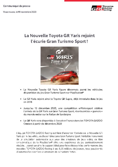 L’équipe TOYOTA GAZOO Racing est fière d’annoncer l’arrivée de la Nouvelle GR Yaris parmi les véhicules disponibles dans Gran Turismo Sport. Véritable monument de la simulation automobile aux yeux des amateurs de jeux vidéo, ce titre emblématique de la PlayStation offre une expérience de jeu particulièrement réaliste. Il constitue ainsi le support idéal pour faire découvrir les performances des modèles TOYOTA GAZOO Racing à ses 8,35 millions de joueurs, tous passionnés d’automobiles sportives...