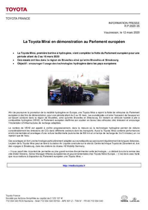 Pour la promotion de la mobilité hydrogène en Europe, une Toyota Mirai a rejoint la flotte de véhicules du Parlement européen à des fins de démonstration, pour une période allant du 2 au 16 mars. Les eurodéputés ont ainsi l'occasion de l'essayer en se faisant conduire dans la région de Bruxelles, ainsi qu'entre Bruxelles et Strasbourg. En testant ce véhicule hybride à pile à combustible hydrogène (VEH2), le Parlement européen réaffirme son soutien en faveur des véhicules zéro émission...