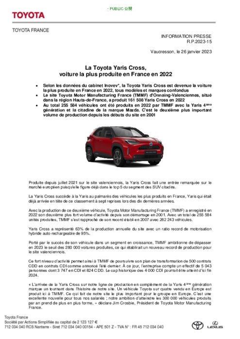 Selon les données du cabinet Inovev*, la Toyota Yaris Cross est devenue la voiture la plus produite en France en 2022, tous modèles et marques confondus. Le site Toyota Motor Manufacturing France (TMMF) d’Onnaing-Valenciennes, situé dans la région Hauts-de-France, a produit 161 508 Yaris Cross en 2022. Au total 255 584 véhicules ont été produits en 2022 par TMMF avec la Yaris 4ème génération et la citadine de la marque Mazda.