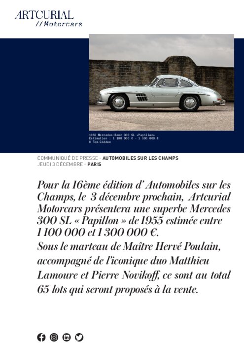 La 16e édition de la vente Automobiles sur les Champs se tiendra jeudi prochain, le 3 décembre, à 16h. Pour la première fois, la vente des 65 véhicules de collection, dont 25 sont proposés sans prix de réserve, se déroulera comme une véritable émission TV, en direct sur les réseaux sociaux ! Trois heures de programme avec Hervé Poulain au marteau, assisté du dynamique duo Matthieu Lamoure / Pierre Novikoff.