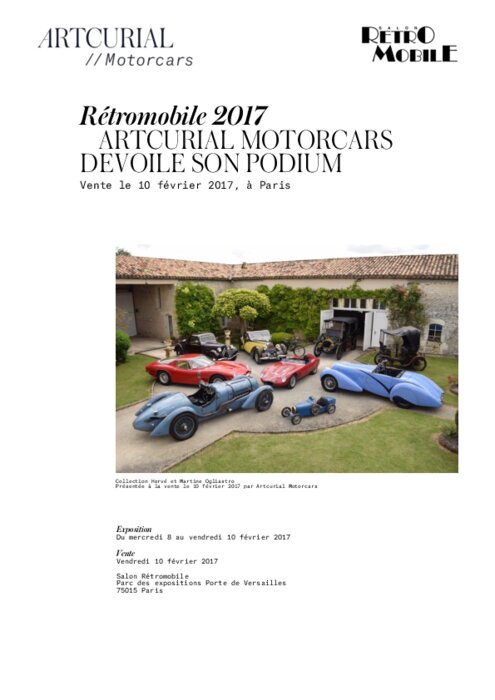 Véritable célébration de la voiture de collection, le Salon Rétromobile est monté en puissance au fil des années et représente aujourd’hui le rendez-vous incontournable des collectionneurs du monde entier dans la «plus belle ville du monde». A cette occasion et au sein même du Salon, Artcurial Motorcars donne rendez-vous aux collectionneurs pour l’une des plus grandes ventes aux enchères en Europe, Rétromobile by Artcurial Motorcars, le 10 février 2017.
