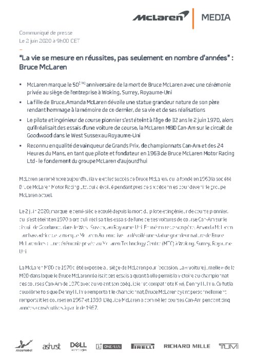McLaren se remémore aujourd'hui la vie et les succès de Bruce McLaren, qui a fondé en 1963 la société Bruce McLaren Motor Racing Ltd, qui a évolué pendant près de six décennies pour devenir le groupe McLaren actuel. Le 2 juin 2020, marque le demi-siècle écoulé depuis la mort du pilote et ingénieur de course pionnier, qui s'est éteint en 1970 alors qu'il réalisait les essais de l'une de ses voitures de course Can-Am sur le circuit de Goodwood dans le West Sussex, au Royaume-Uni...