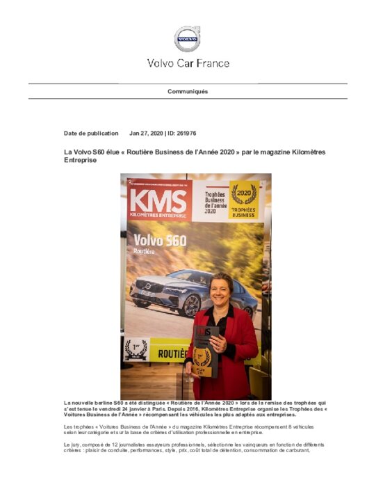 La nouvelle berline S60 a été distinguée " Routière de l’Année 2020 " lors de la remise des trophées qui s’est tenue le vendredi 24 janvier à Paris. Depuis 2016, Kilomètres Entreprise organise les Trophées des " Voitures Business de l’Année " récompensant les véhicules les plus adaptés aux entreprises.
