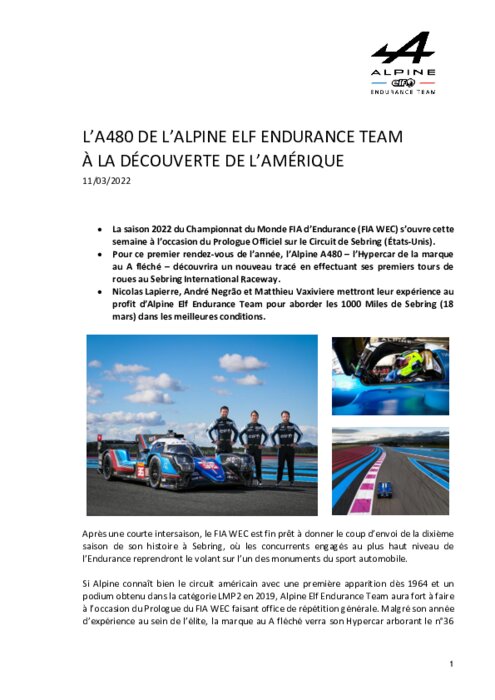 La saison 2022 du Championnat du Monde FIA d’Endurance s’ouvre cette semaine à l’occasion du Prologue Officiel sur le Circuit de Sebring (USA). Pour ce premier rendez-vous de l’année, l’Alpine A480 – l’Hypercar de la marque au A fléché – découvrira un nouveau tracé en effectuant ses premiers tours de roues au Sebring International Raceway. Nicolas Lapierre, André Negrão et Matthieu Vaxiviere mettront leur expérience au profit d’Alpine Elf Endurance Team pour aborder les 1000 Miles de Sebring...