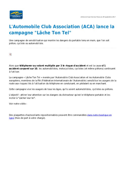 La campagne « Lâche Ton Tel » menée par l'Automobile Club Association et les Automobile Clubs européens, membres de la FIA (Fédération Internationale de l'Automobile) sensibilise les usagers de la route aux risques liés à l'utilisation du téléphone en conduisant, en pédalant ou en marchant. Cette campagne vise les usagers de tous les âges, qu'ils soient automobilistes, cyclistes ou piétons.
