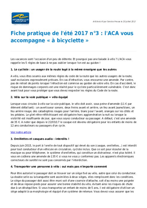 Les vacances sont l'occasion d'un peu de détente. Et pourquoi pas une balade à vélo ? L'ACA vous rappelle les 5 règles de base à ne pas oublier lorsque l'on est au guidon !