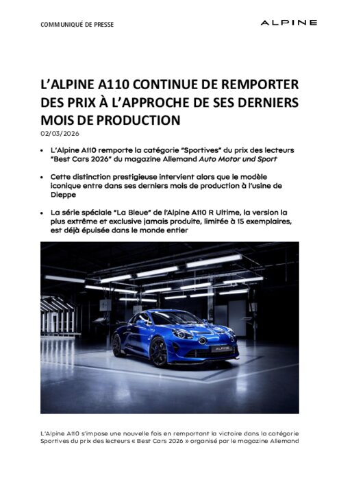 Véritable pièce de collection, l’A110 R Ultime est produite à seulement 110 exemplaires, dont 15 modèles ultra-exclusifs baptisés “La Bleue”. Véritables démonstrateurs du savoir‑faire de personnalisation Alpine, ils sont désormais tous vendus. Ils se distinguent par une fusion de deux bleus emblématiques de la marque, appliqués sur la carrosserie selon un dégradé réalisé à la main à l’usine de Dieppe, combinant le Bleu Abysse et le Bleu Alpine Vision. L’habitacle en cuir bleu unique a été conçu par Poltrona Frau® et Sabelt®, illustrant de manière exclusive les possibilités de personnalisation sur mesure offertes par l’Atelier Alpine.