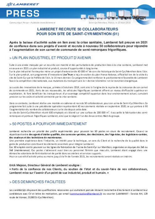 Après la baisse d’activité subie en lien avec la crise sanitaire, Lamberet fait preuve en 2021 de confiance dans ses projets d’avenir et recrute à nouveau 50 collaborateurs pour répondre à l’augmentation de son carnet de commande de semi-remorques frigorifiques.