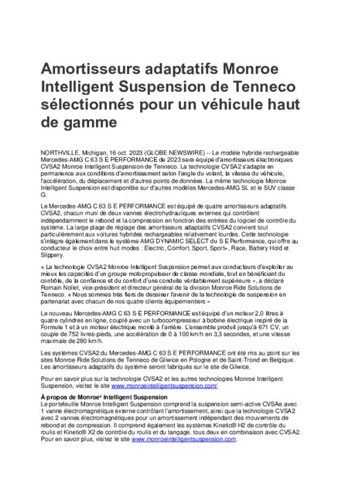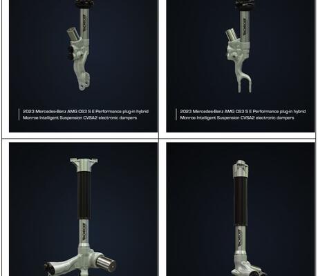 Le modèle hybride rechargeable Mercedes-AMG C 63 S E PERFORMANCE de 2023 sera équipé d’amortisseurs électroniques CVSA2 Monroe Intelligent Suspension de Tenneco. La technologie CVSA2 s'adapte en permanence aux conditions d’amortissement selon l’angle du volant, la vitesse du véhicule, l'accélération, du déplacement et d'autres points de données.