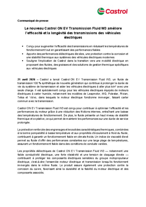 Lancement de Castrol ON EV Transmission Fluid W3
