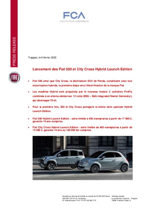 2020 marque un nouveau jalon dans l'histoire de la marque Fiat. Avec le lancement des nouvelles versions hybrides de Fiat 500 et de City Cross (voir communiqué du 9 janvier : lien), c’est l'électrification de la Marque qui débute. Et pour la première fois dans l'histoire de ces deux modèles emblématiques et complémentaires de la marque Fiat, 500 et City Cross Hybrid sont disponibles dans une série spéciale de lancement exclusive Launch Edition...