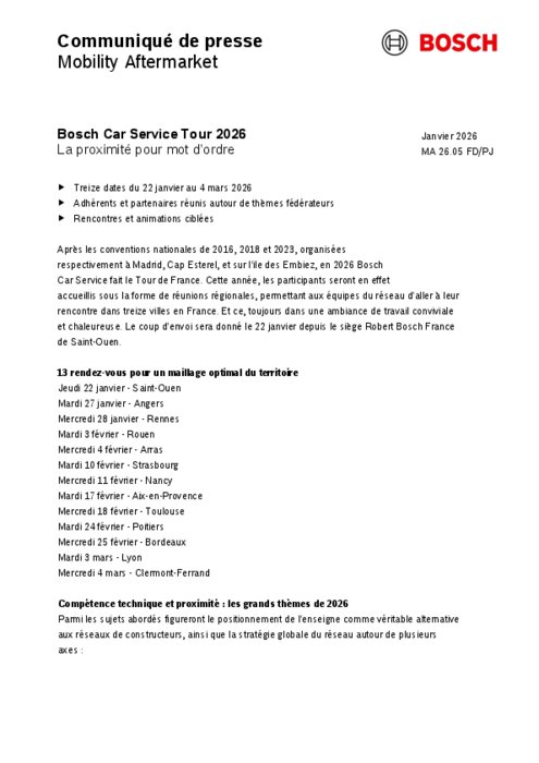 Réparateurs 15 janvier 2026 - 12:47 Cette année, les participants seront accueillis lors de réunions régionales, permettant aux équipes Bosch Mobility Aftermarket d’aller à leur rencontre sur tout le territoire avant de célébrer en septembre prochain les 25 ans du réseau. PDF (151 Ko) Télécharger credit Bosch