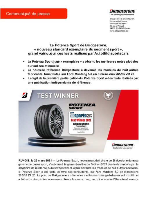 Le Potenza Sport, nouveau produit phare de Bridgestone dans sa gamme de pneus sport, s’est classé largement en tête de l’édition 2021 des tests conduits par le magazine de référence AutoBild sportscars. Ayant devancé les modèles de huit autres fabricants, le Potenza Sport a été testé, comme ses concurrents, sur Ford Mustang 5.0 en dimensions 265/35 ZR 20. Le pneu de Bridgestone a obtenu les meilleures notes globales sur sol mouillé, et a fait valoir des performances exceptionnelles sur sol sec.