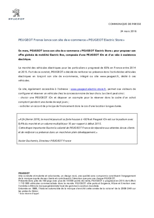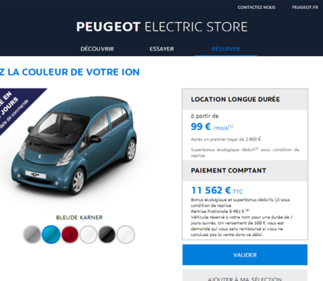 Constructeurs 24 mars 2016 - 12:01 En mars, PEUGEOT lance son site de e-commerce " PEUGEOT Electric Store " pour proposer son offre globale de mobilité Electric Box, composée d'une PEUGEOT iOn et d'un vélo à assistance électrique. PDF (35 Ko) Télécharger