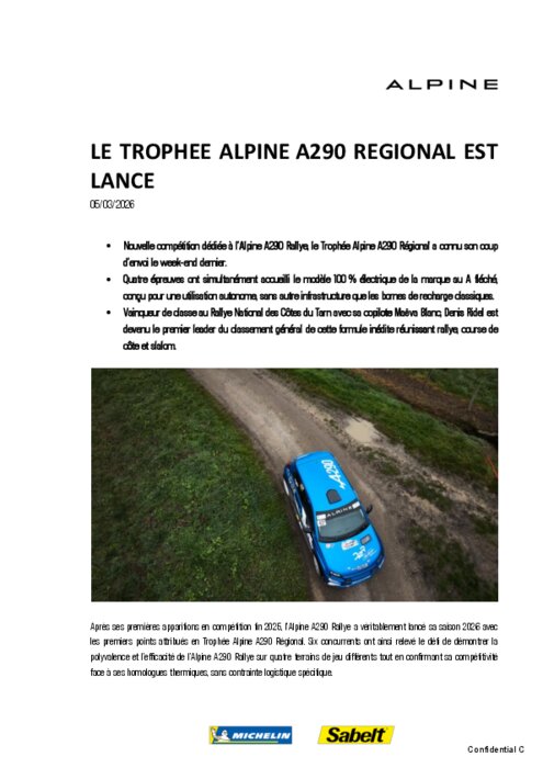 Après ses premières apparitions en compétition fin 2025, l’Alpine A290 Rallye a véritablement lancé sa saison 2026 avec les premiers points attribués en Trophée Alpine A290 Régional. Six concurrents ont ainsi relevé le défi de démontrer la polyvalence et l’efficacité de l’Alpine A290 Rallye sur quatre terrains de jeu différents tout en confirmant sa compétitivité face à ses homologues thermiques, sans contrainte logistique spécifique.