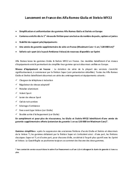 Alfa Romeo lance les gammes Giulia & Stelvio MY22 en France. Ces modèles bénéficient d’un niveau d’équipement enrichi permettant de simplifier leur gamme qui est désormais unifiée en Europe. Niveau d’équipement en hausse : La dotation de série de la plupart des versions s’enrichit significativement, à commencer par la finition Super (voir présentation détaillée). Toutes les Alfa Romeo Giulia et Stelvio bénéficient désormais en série de nouveaux aménagements et équipements...