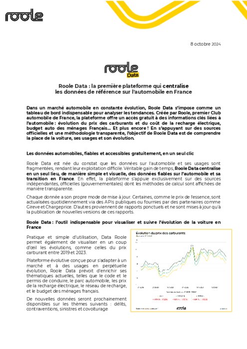 Dans un marché automobile en constante évolution, Roole Data s’impose comme un tableau de bord indispensable pour analyser les tendances. Créée par Roole, premier Club automobile de France, la plateforme offre un accès gratuit à des informations clés liées à l’automobile : évolution du prix des carburants et du coût de la recharge électrique, budget auto des ménages Français… En s’appuyant sur des sources officielles et une méthodologie transparente, l’objectif de Roole Data est de comprendre la place de la voiture, ses usages et son évolution.