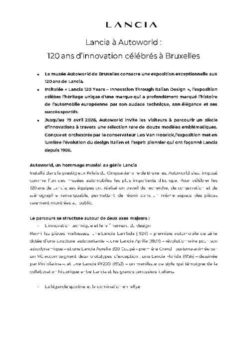 Installé dans le prestigieux Palais du Cinquantenaire de Bruxelles, Autoworld s’est imposé comme l’un des musées automobiles les plus importants d’Europe. Pour célébrer les 120 ans de Lancia, ses équipes ont réalisé un travail de recherche, de conservation et de scénographie remarquable, permettant de réunir dans un même espace des pièces rarement montrées au public.