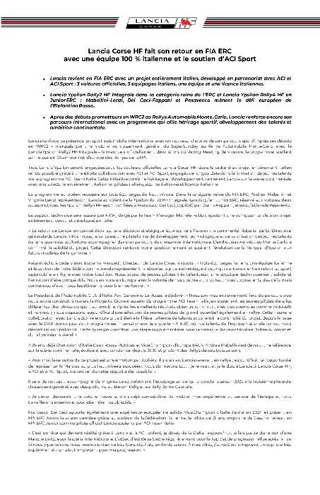 Lancia renforce sa présence en sport automobile international avec un nouveau chapitre de son parcours sportif. Après ses débuts en WRC2 – marqués par une victoire au classement général du SuperSunday au Rallye Automobile Monte‑Carlo avec la Lancia Ypsilon Rally2 HF Integrale – la marque a officiellement dévoilé, lors du Racing Meeting de Vicence, le programme scellant son retour en Championnat d’Europe des Rallyes de la FIA.