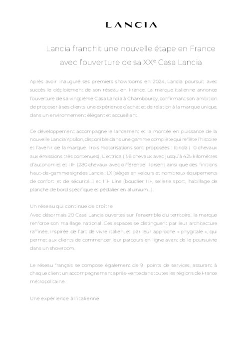 Après avoir inauguré ses premiers showrooms en 2024, Lancia poursuit avec succès le déploiement de son réseau en France. La marque italienne annonce l’ouverture de sa vingtième Casa Lancia à Chambourcy, confirmant son ambition de proposer à ses clients une expérience d’achat et de relation à la marque unique, dans un environnement élégant et accueillant.