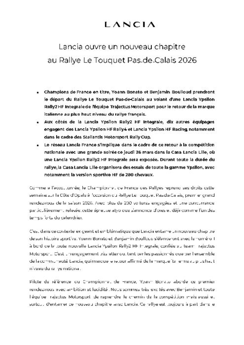 Lancia ouvre un nouveau chapitre au Rallye Le Touquet Pas‑de‑Calais 2026