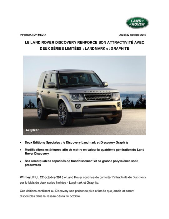 Land Rover continue de conforter l’attractivité du Discovery par le biais de deux series limitées - Landmark et Graphite. Ces éditions confèrent au Discovery une présence plus affirmée que jamais et seront disponibles dans le réseau dès la fin octobre. Graphite « L’attractivité du Land Rover Discovery est encore renforcée. Nous avons lancé deux éditions spéciales – Landmark et Graphite – qui proposent aux clients une présence sur la route plus affirmée et un confort encore supérieur.