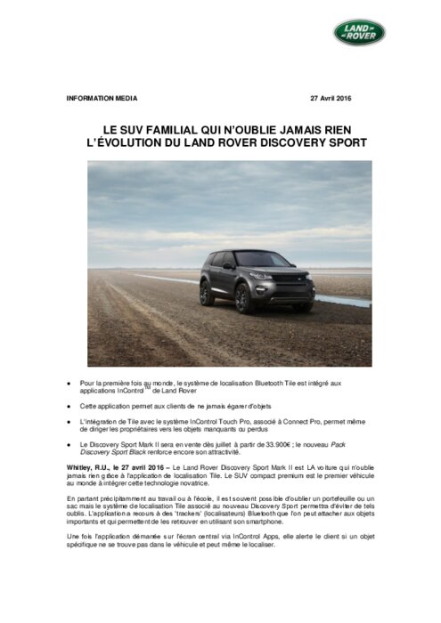 Le Land Rover Discovery Sport Mark II est LA voiture qui n’oublie jamais rien grâce à l’application de localisation Tile. Le SUV compact premium est le premier véhicule au monde à intégrer cette technologie novatrice. En partant précipitamment au travail ou à l’école, il est souvent possible d’oublier un portefeuille ou un sac mais le système de localisation Tile associé au nouveau Discovery Sport permettra d’éviter de tels oublis.