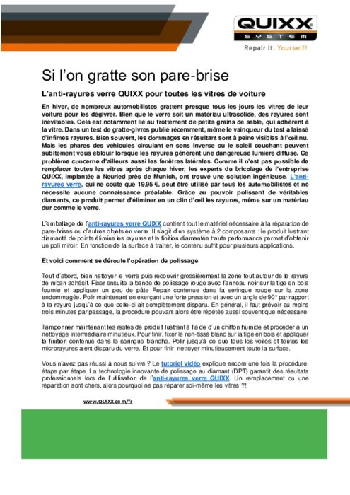 Comme il n’est pas possible de remplacer toutes les vitres après chaque hiver, les experts du bricolage de l’entreprise QUIXX, implantée à Neuried près de Munich, ont trouvé une solution ingénieuse. L’anti-rayures verre, qui ne coûte que 19,95 €, peut être utilisé par tous les automobilistes et ne nécessite aucune connaissance préalable. Grâce au pouvoir polissant de véritables diamants, ce produit permet d’éliminer en un clin d’oeil les rayures, même sur un matériau dur comme le verre.