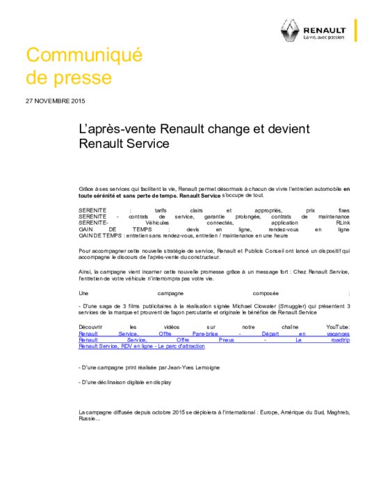 Constructeurs 27 novembre 2015 - 14:02 Grâce à ses services qui facilitent la vie, Renault permet désormais à chacun de vivre l’entretien automobile en toute sérénité et sans perte de temps. Renault Service s’occupe de tout. PDF (87 Ko) Télécharger