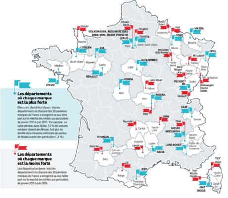 D’un département à l’autre, les goûts et usages en matière d’automobiles diffèrent, les moyens financiers également, de sorte que la présence de chaque marque varie fortement : chacune possède ses bastions et ses zones d’ombre.