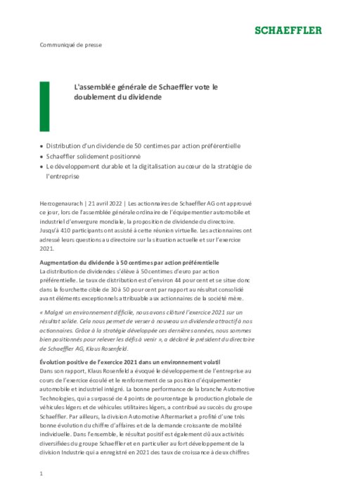 Les actionnaires de Schaeffler AG ont approuvé ce jour, lors de l’assemblée générale ordinaire de l’équipementier automobile et industriel d’envergure mondiale, la proposition de dividende du directoire. Jusqu’à 410 participants ont assisté à cette réunion virtuelle. Les actionnaires ont adressé leurs questions au directoire sur la situation actuelle et sur l’exercice 2021.