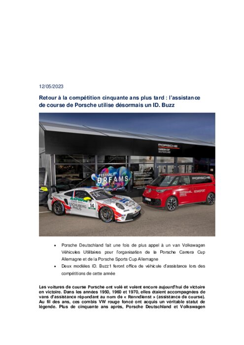 Porsche Deutschland fait une fois de plus appel à un van Volkswagen Véhicules Utilitaires pour l’organisation de la Porsche Carrera Cup Allemagne et de la Porsche Sports Cup Allemagne Deux modèles ID. Buzz1 feront office de véhicule d’assistance lors des compétitions de cette année
