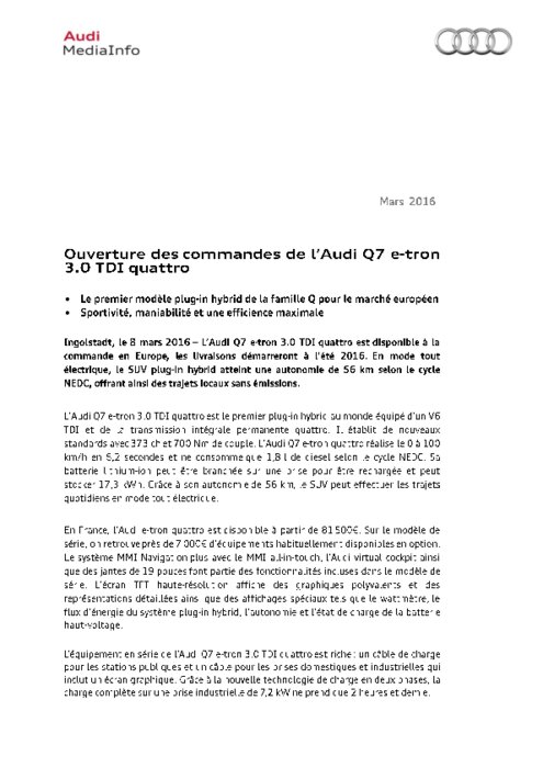 L’Audi Q7 e-tron 3.0 TDI quattro est disponible à la commande en Europe, les livraisons démarreront à l’été 2016. En mode tout électrique, le SUV plug-in hybrid atteint une autonomie de 56 km selon le cycle NEDC, offrant ainsi des trajets locaux sans émissions.