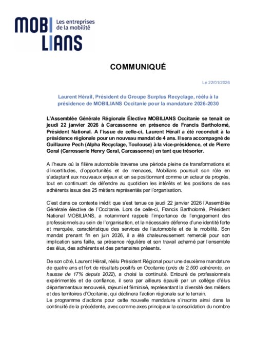 L’Assemblée Générale Régionale Élective MOBILIANS Occitanie se tenait ce jeudi 22 janvier 2026 à Carcassonne en présence de Francis Bartholomé, Président National. A l’issue de celle-ci, Laurent Hérail a été reconduit à la présidence régionale pour un nouveau mandat de 4 ans. Il sera accompagné de Guillaume Pech (Alpha Recyclage, Toulouse) à la vice-présidence, et de Pierre Geral (Carrosserie Henry Geral, Carcassonne) en tant que trésorier.