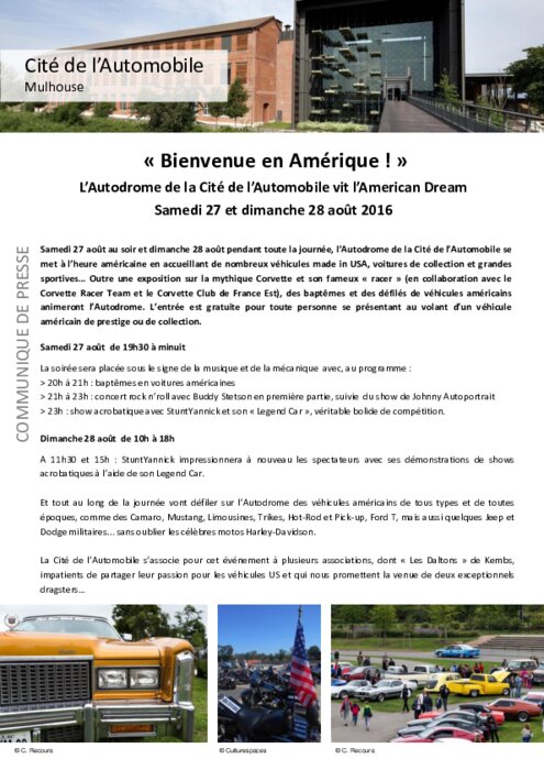 Samedi 27 août au soir et dimanche 28 août pendant toute la journée, l’Autodrome de la Cité de l’Automobile se met à l’heure américaine en accueillant de nombreux véhicules made in USA, voitures de collection et grandes sportives… Outre une exposition sur la mythique Corvette et son fameux « racer » (en collaboration avec le Corvette Racer Team et le Corvette Club de France Est), des baptêmes et des défilés de véhicules américains animeront l’Autodrome.