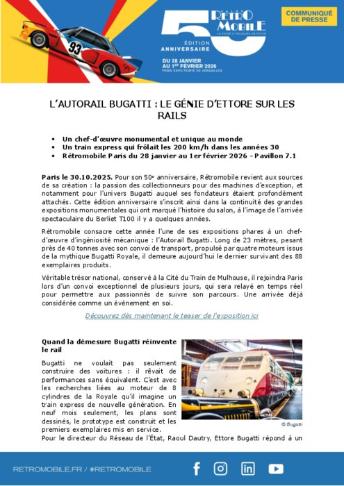 Pour son 50ᵉanniversaire, Rétromobile revient aux sources de sa création : la passion des collectionneurs pour des machines d’exception, et notamment pour l’univers Bugatti auquel ses fondateurs étaient profondément attachés. Cette édition anniversaire s’inscrit ainsi dans la continuité des grandes expositions monumentales qui ont marqué l’histoire du salon, à l’image de l’arrivée spectaculaire du Berliet T100 il y a quelques années.