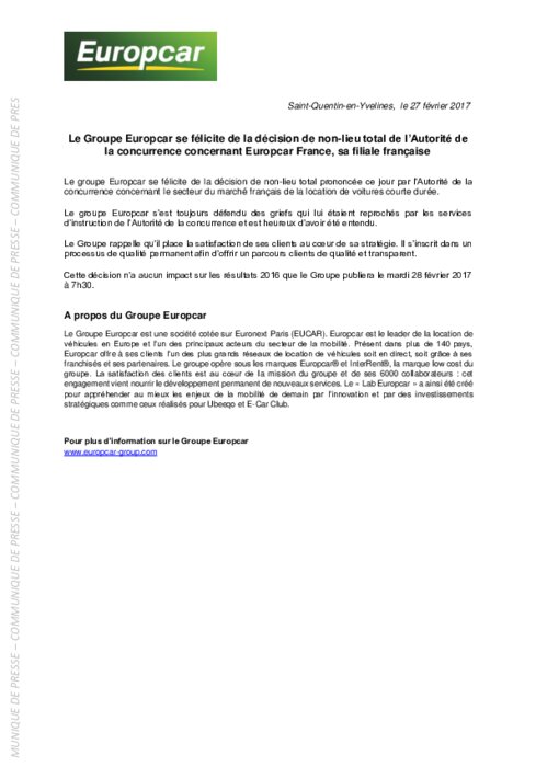 Le groupe Europcar se félicite de la décision de non-lieu total prononcée ce jour par l’Autorité de la concurrence concernant le secteur du marché français de la location de voitures courte durée.