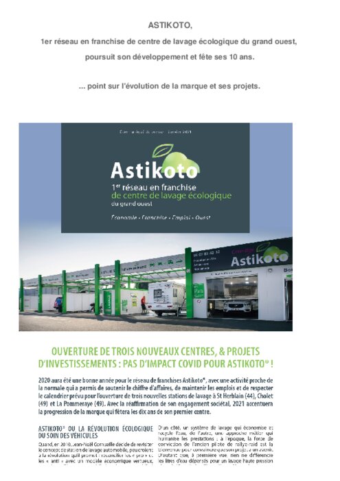 2020 aura été une bonne année pour le réseau de franchise Astikoto qui fête ses 10 ans, avec une activité proche de la normale qui a permis de soutenir le chiffre d'affaires, de maintenir les emplois et de respecter le calendrier prévu pour l'ouverture de trois nouvelles stations de lavage
