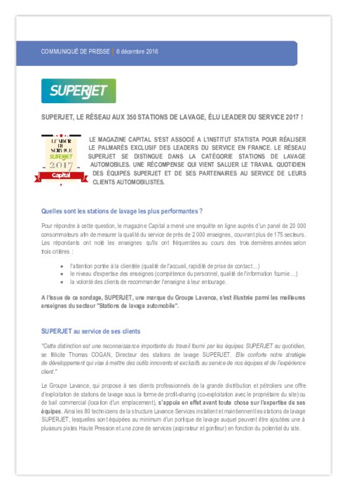 Services 06 décembre 2016 - 22:34 Le magazine Capital s’est associé à l’institut Statista pour réaliser le palmarès exclusif des leaders du service en France. Le réseau SUPERJET se distingue dans la catégorie stations de lavage automobiles. PDF (590 Ko) Télécharger