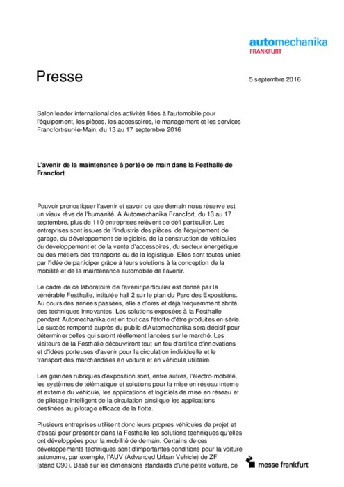 Pouvoir pronostiquer l'avenir et savoir ce que demain nous réserve est un vieux rêve de l'humanité. A Automechanika Francfort, du 13 au 17 septembre, plus de 110 entreprises relèvent ce défi particulier. Les entreprises sont issues de l'industrie des pièces, de l'équipement de garage, du développement de logiciels, de la construction de véhicules du développement et de la vente d'accessoires, du secteur énergétique ou des métiers des transports ou de la logistique.