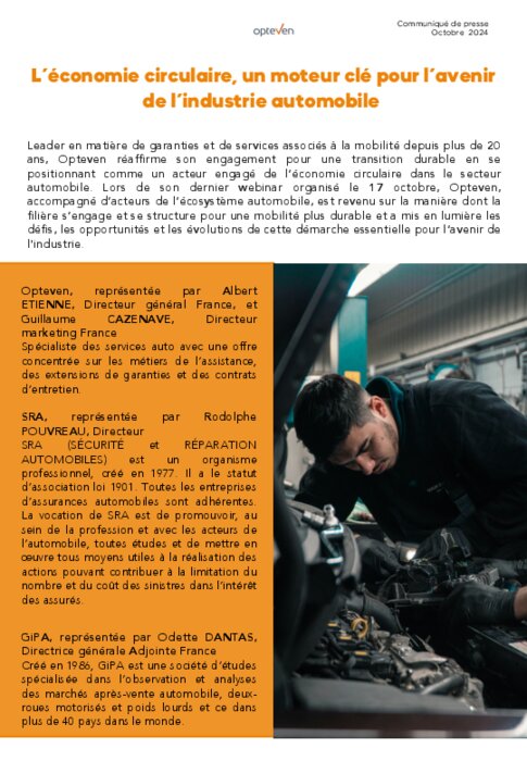 Leader en matière de garanties et de services associés à la mobilité depuis plus de 20 ans, Opteven réaffirme son engagement pour une transition durable en se positionnant comme un acteur engagé de l’économie circulaire dans le secteur automobile. Lors de son dernier webinar organisé le 17 octobre, Opteven, accompagné d’acteurs de l’écosystème automobile, est revenu sur la manière dont la filière s’engage et se structure pour une mobilité plus durable et a mis en lumière les défis, les opportunités et les évolutions de cette démarche essentielle pour l’avenir de l'industrie.