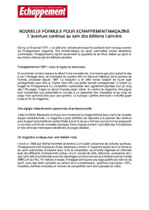 Les éditions Larivière annoncent la sortie du tout nouveau numéro de Echappement magazine, titre emblématique du sport automobile toutes disciplines confondues. Echappement a rejoint récemment la quarantaine de titres dédiés au sport et aux loisirs détenus par les éditions Larivière.