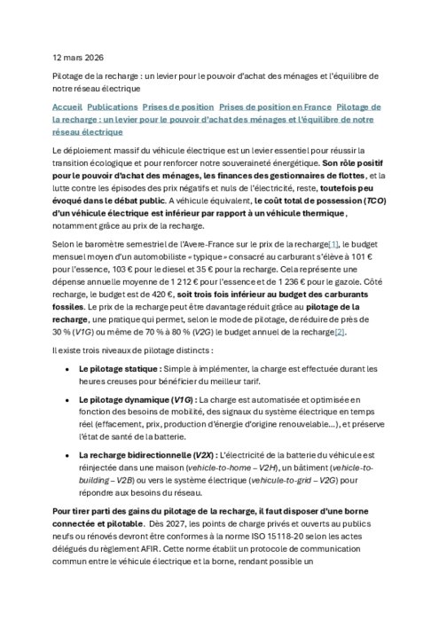 Services 12 mars 2026 - 09:50 L’Avere et l’Union Française de l’Électricité publient aujourd’hui une note de position commune appelant les pouvoirs publics à accélérer le déploiement de la recharge pilotée des véhicules électriques, et plus largement des usages électriques. PDF (184 Ko) Télécharger avere