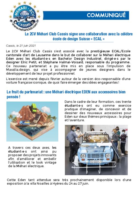 Le 2CV Méhari Club Cassis s’est associé avec la prestigieuse ECAL/Ecole cantonale d’art de Lausanne dans le but de collaborer sur la Méhari électrique Eden avec les étudiant-e-s en Bachelor Design Industriel, dirigés par le designer Elric Petit, et Stéphane Halmaï-Voisard, responsable du programme. Ce nouveau partenariat a pu être mis en place sous l’impulsion de Massilia.design, qui vise à accompagner de jeunes designers dans le développement de leur projet professionnel.