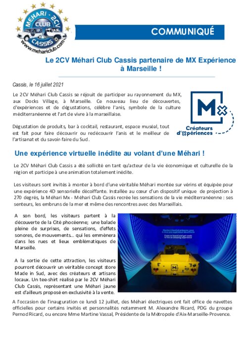 Le 2CV Méhari Club Cassis se réjouit de participer au rayonnement du MX, aux Docks Village, à Marseille. Ce nouveau lieu de découvertes, d'expériences et de dégustations, célèbre l'anis, symbole de la culture méditerranéenne et l'art de vivre à la marseillaise. Dégustation de produits, bar à cocktail, restaurant, espace muséal, tout est fait pour faire découvrir ou redécouvrir l'anis et le meilleur de l'artisanat et du savoir-faire du Sud .