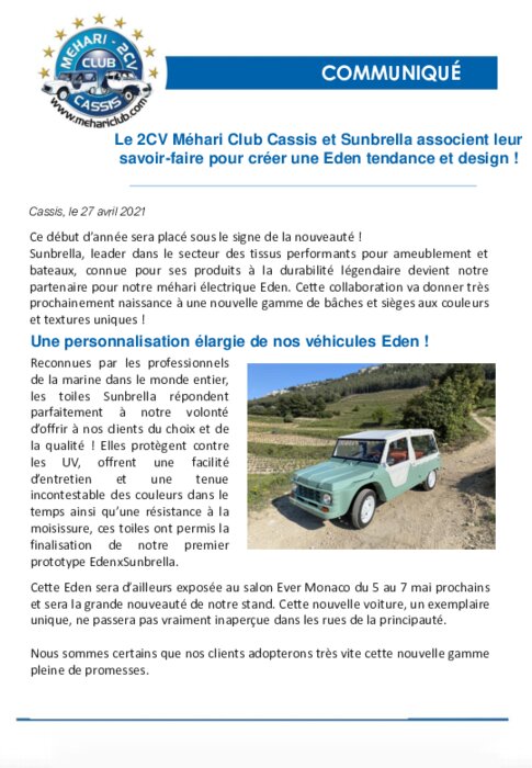 Ce début d'année sera placé sous le signe de la nouveauté ! Sunbrella, leader dans le secteur des tissus performants pour ameublement et bateaux, connue pour ses produits à la durabilité légendaire devient notre partenaire pour notre méhari électrique Eden. Cette collaboration va donner très prochainement naissance à une nouvelle gamme de bâches et sièges aux couleurs et textures uniques !
