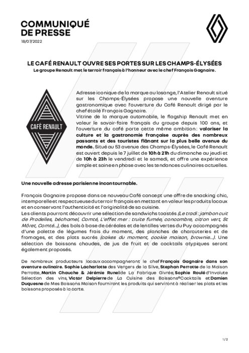 Constructeurs 18 juillet 2022 - 14:45 Adresse iconique de la marque au losange, l’Atelier Renault situé sur les Champs-Elysées propose une nouvelle aventure gastronomique avec l’ouverture du Café Renault dirigé par le chef étoilé François Gagnaire. PDF (717 Ko) Télécharger