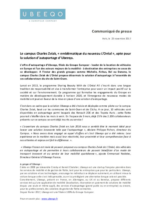 L’offre d’autopartage d’Ubeeqo, filiale du Groupe Europcar - leader de la location de véhicules en Europe et l’un des acteurs majeurs de la mobilité - à destination des entreprises ne cesse de se développer. A l’instar des grands groupes comme Michelin, Airbus, Bel ou Danone, le campus Charles Zviak de L’Oréal propose désormais la solution d’autopartage à l’ensemble de ses collaborateurs du site de Saint-Ouen.