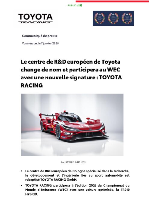 Toyota Motor Corporation et TOYOTA RACING GmbH ont modifié le nom de leur centre de recherche et développement européen « TOYOTA GAZOO Racing Europe GmbH » (Cologne, Allemagne) qui devient « TOYOTA RACING GmbH ». Cette nouvelle appellation est effective à compter du 7 janvier 2026.